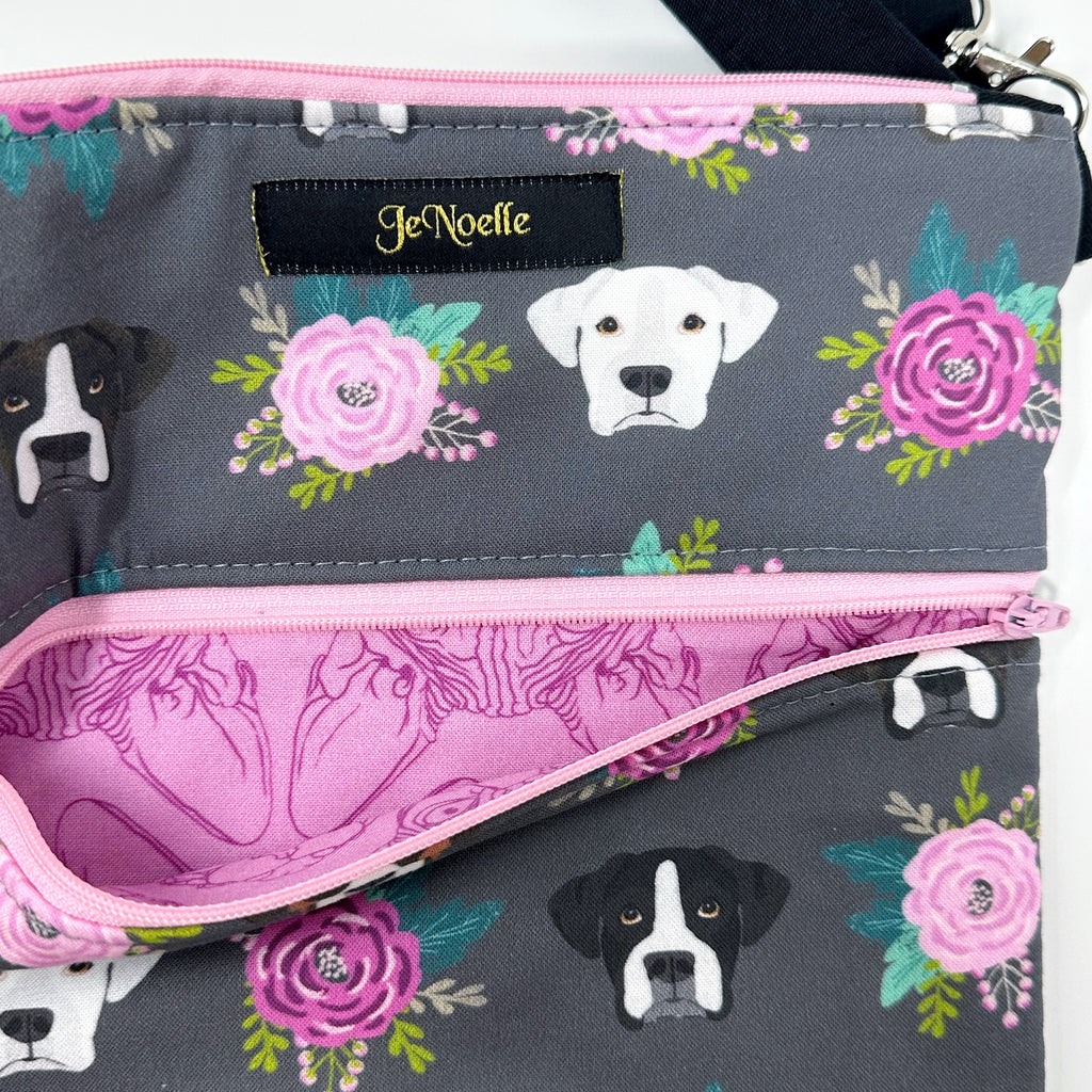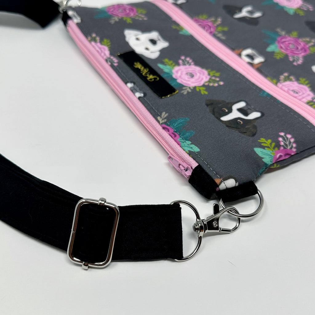 • Materials: Cotton/polyester fabrics, 2 pink zippers, silver hardware, detachable/adjustable shoulder strap attachment