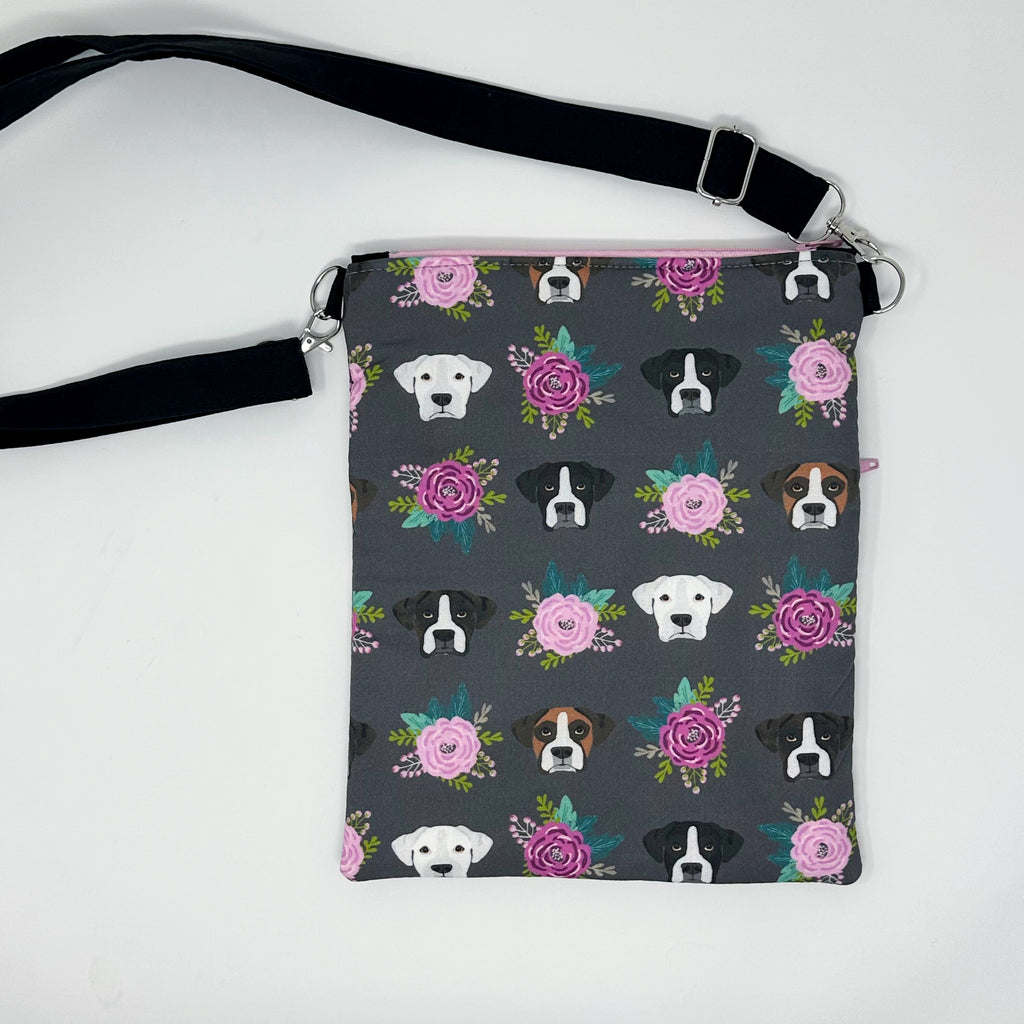 Our Pretty Baby crossbody bag is made out of cotton fabrics. This handbag has two zippered pockets to help keep your belongings organized and allows for extra storage. Included is a polyester/cotton blend adjustable shoulder strap.