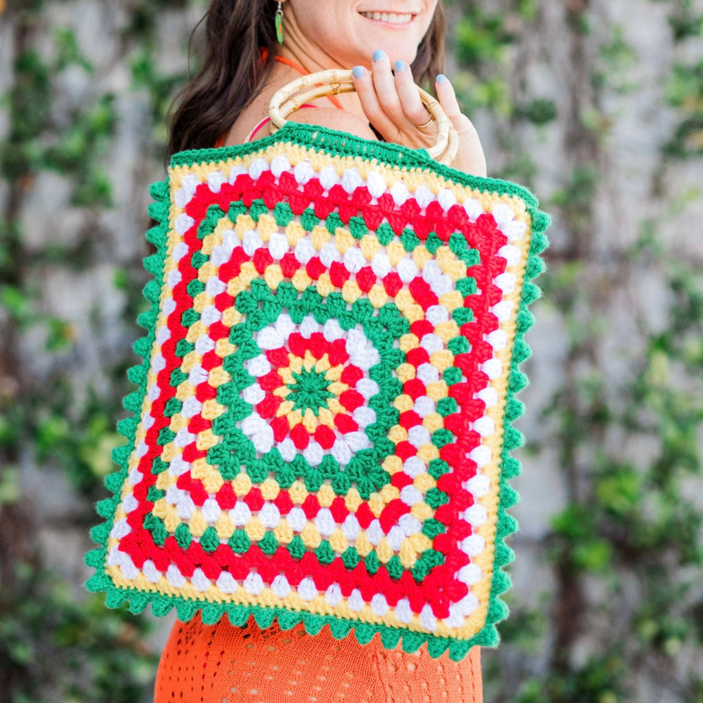 This funky, one-of-a-kind granny square crochet bag is handmade with love and care. Featuring a large bobble border, this bag is perfect for every day use.