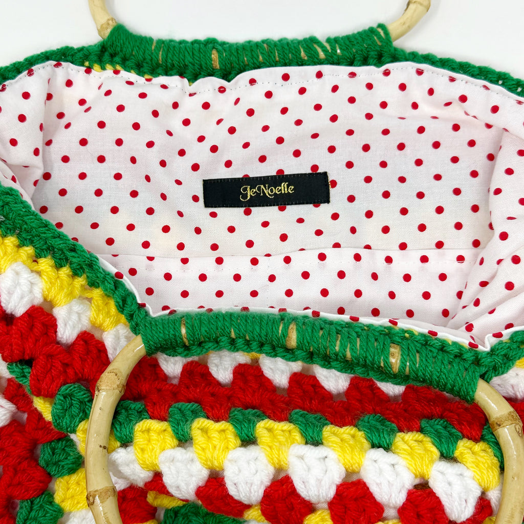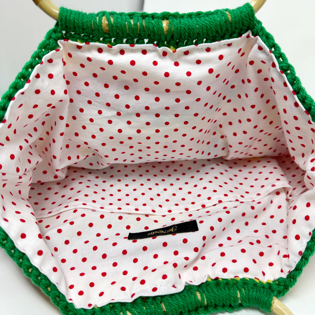 The handle is made out of bamboo and crocheted into the top of the bag. Inside has a white and red polka dot cotton fabric lining. You will find 2 open pockets inside to help keep your belongings more organized.