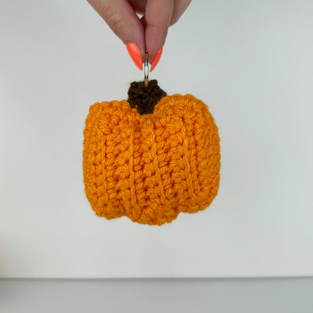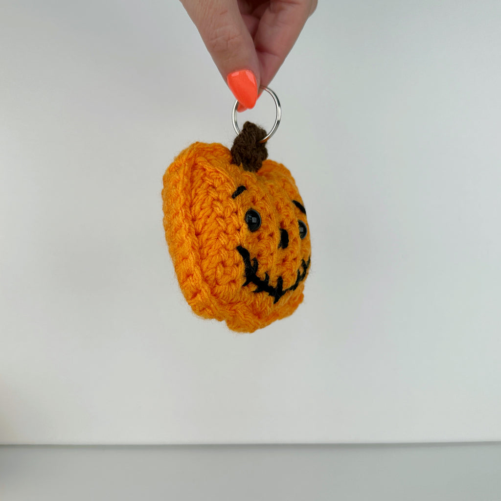 Crochet jack-o’-lantern keychain with stitched mouth detail.