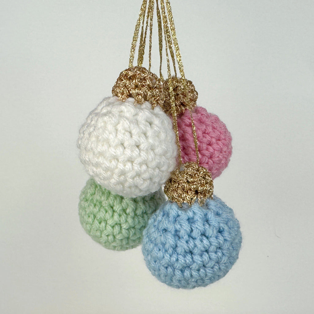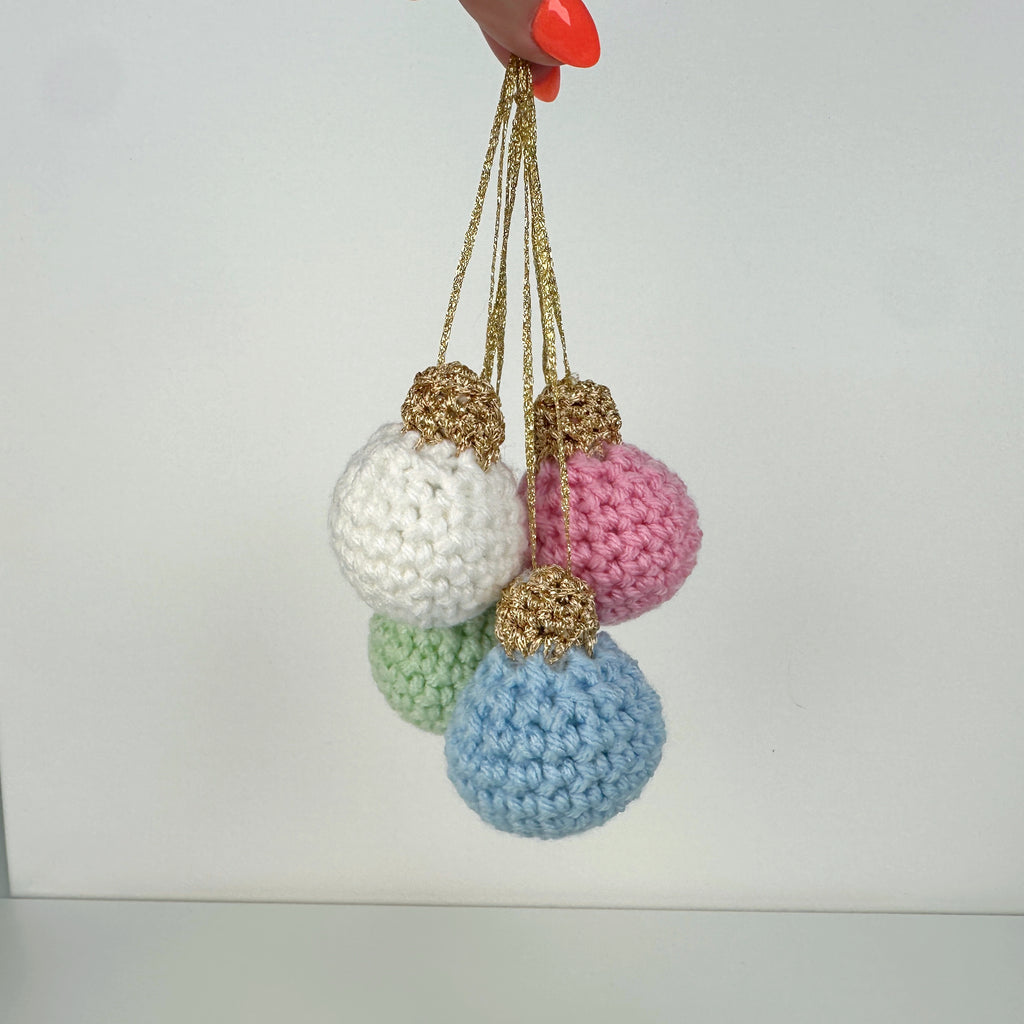 Set of four mini plush crocheted ornaments. Glittery gold yarn adds an extra shimmer to the top of each!