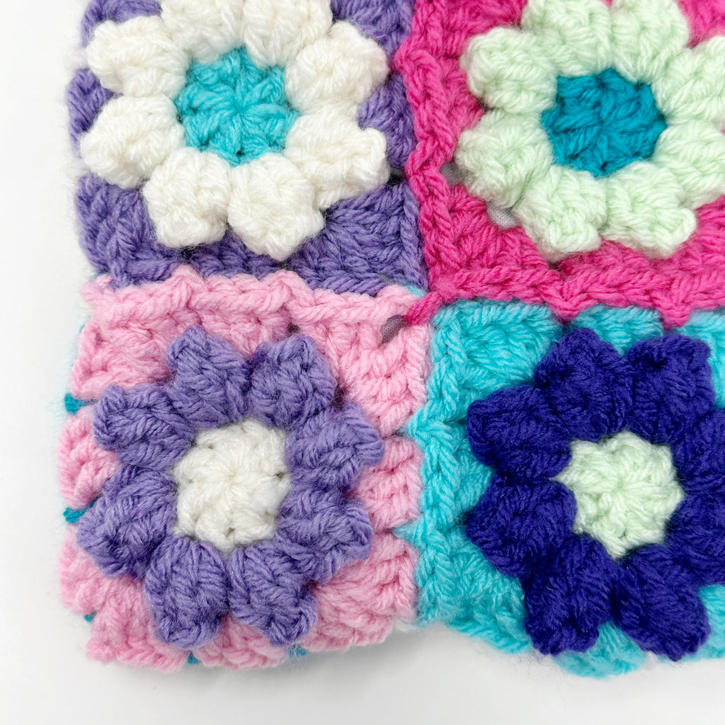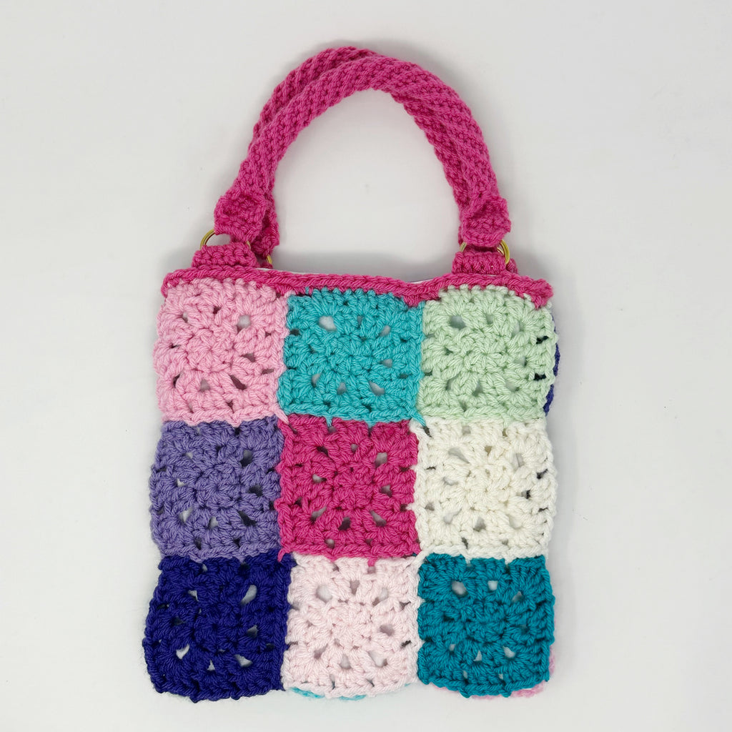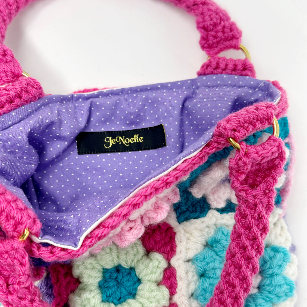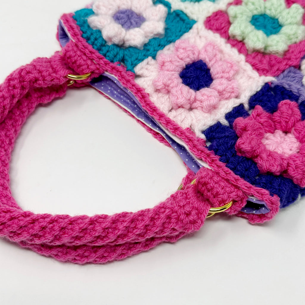 This piece is truly one of a kind. On the front of the bag you’ll find 9 crochet flower squares in an assortment of colors. The back of the bag has simple granny squares matching the colors from the front.