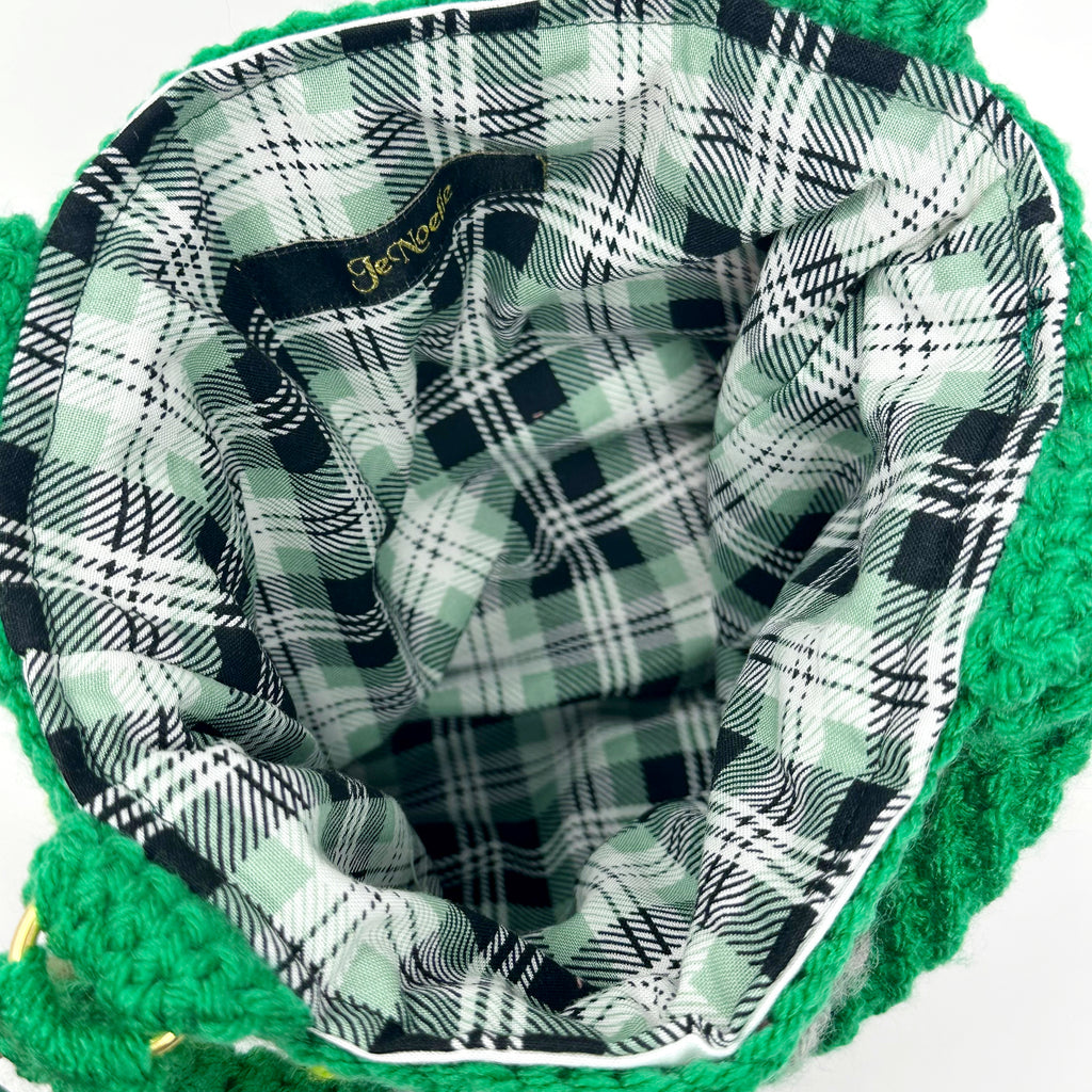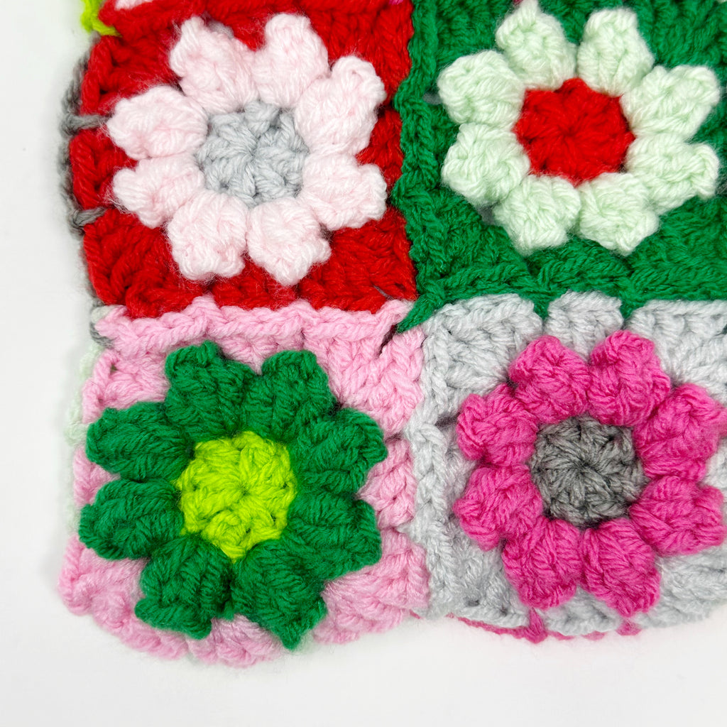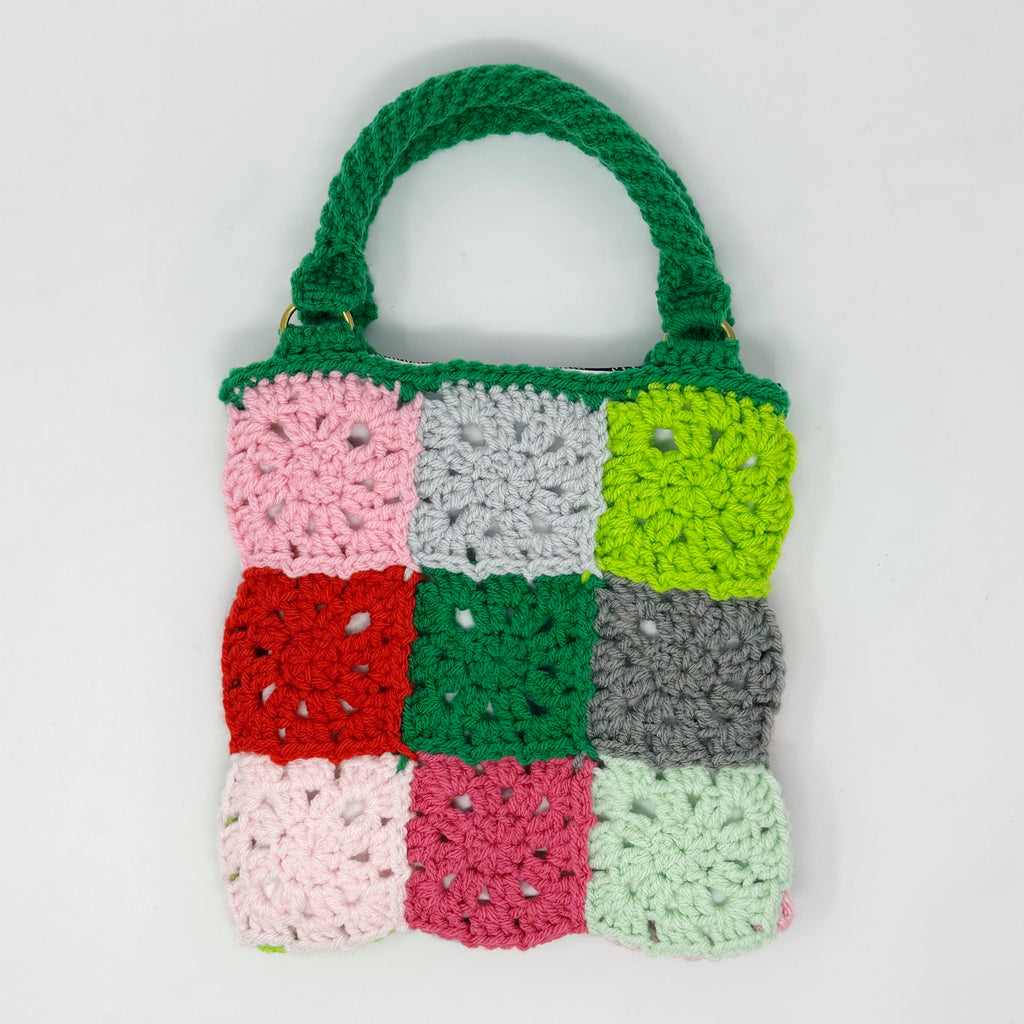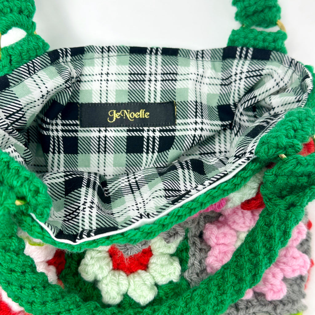This piece is truly one of a kind. On the front of the bag you’ll find 9 crochet flower squares in an assortment of colors. The back of the bag has simple granny squares matching the colors from the front.