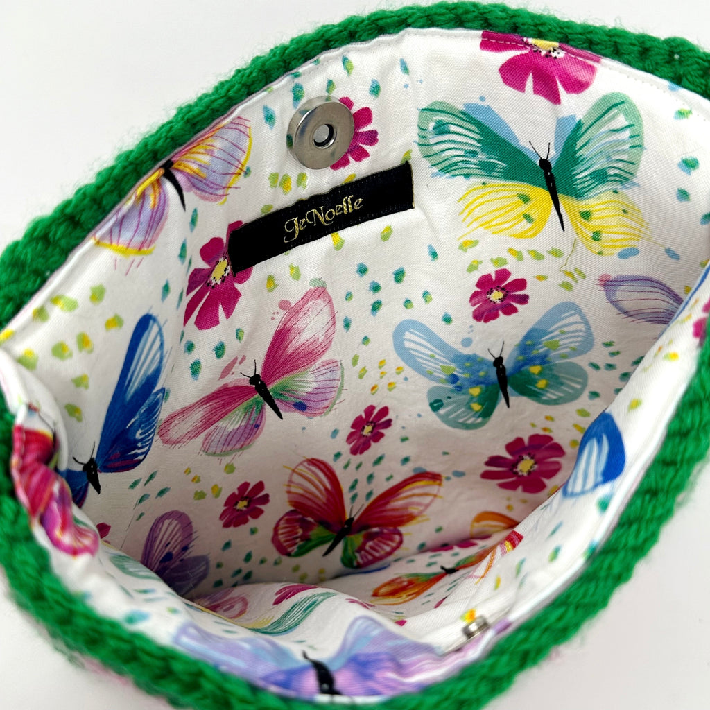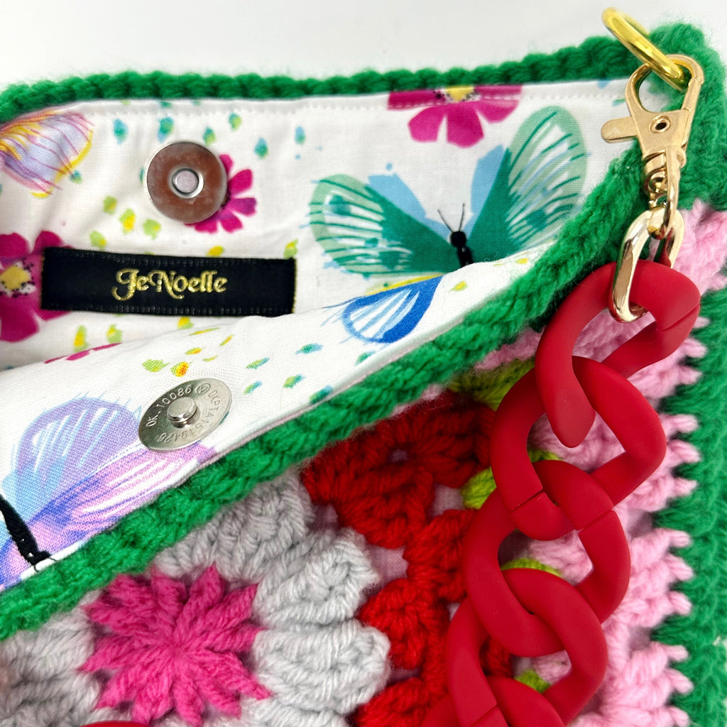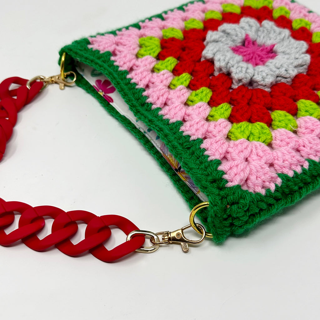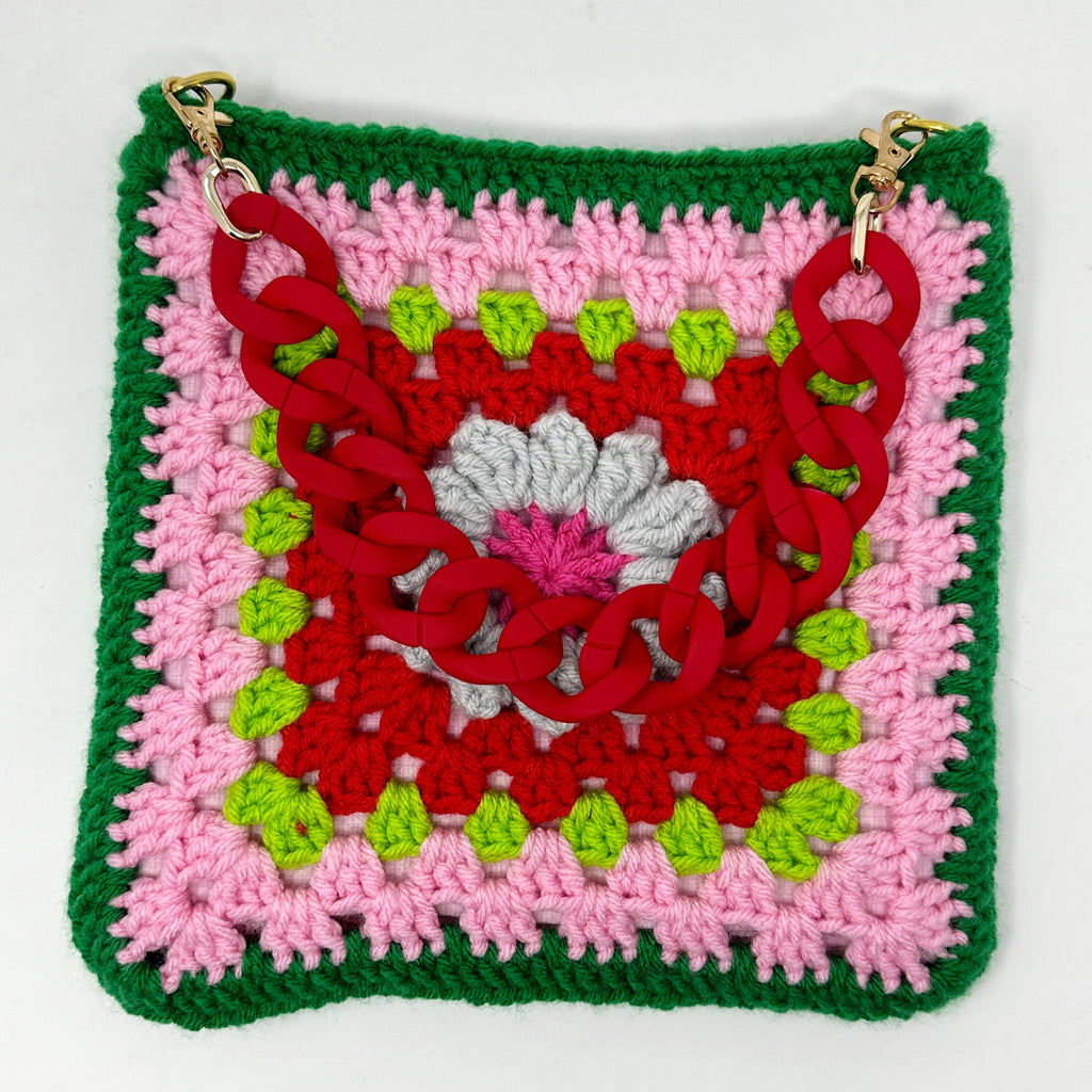 Show off your style with this unique Strawberry Pie flower crochet granny square bag. The perfect addition to any outfit, this handmade bag is made with acrylic yarn in shades of greens, reds & pinks. The red handle is a large flat acrylic chain strap. Inside has a magnetic clasp closure to help keep your belongings safe & secure.